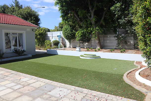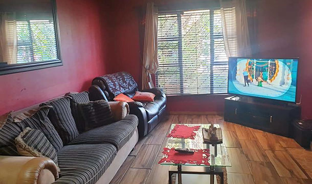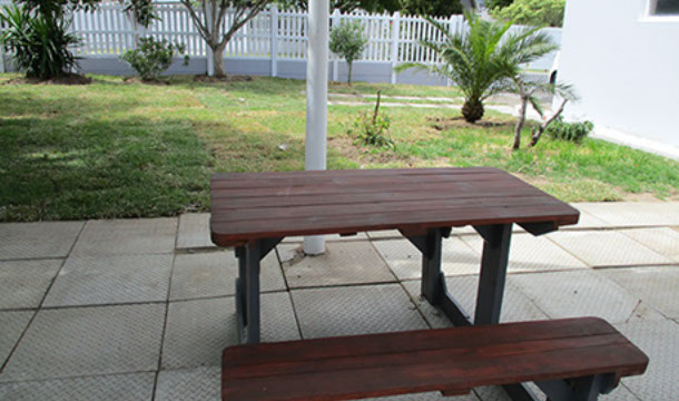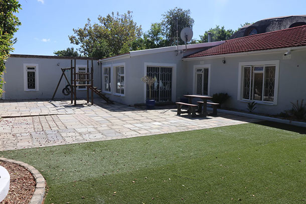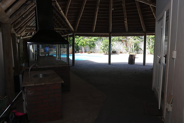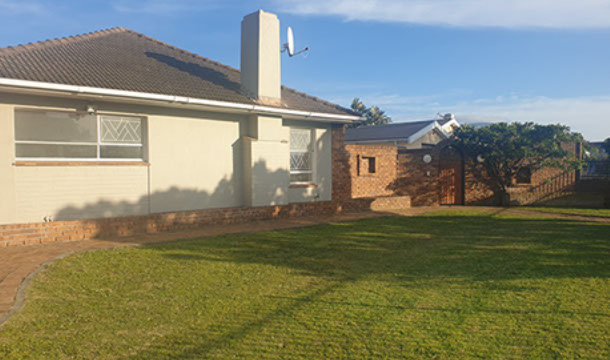 An outside covered entertainment area with a braai pit set in large,serene garden perfect for entertaining during the summer days. Loads of space for kids to play safely. The home is situated in a quiet, friendly neighbourhood and just 4minutes to the beach.